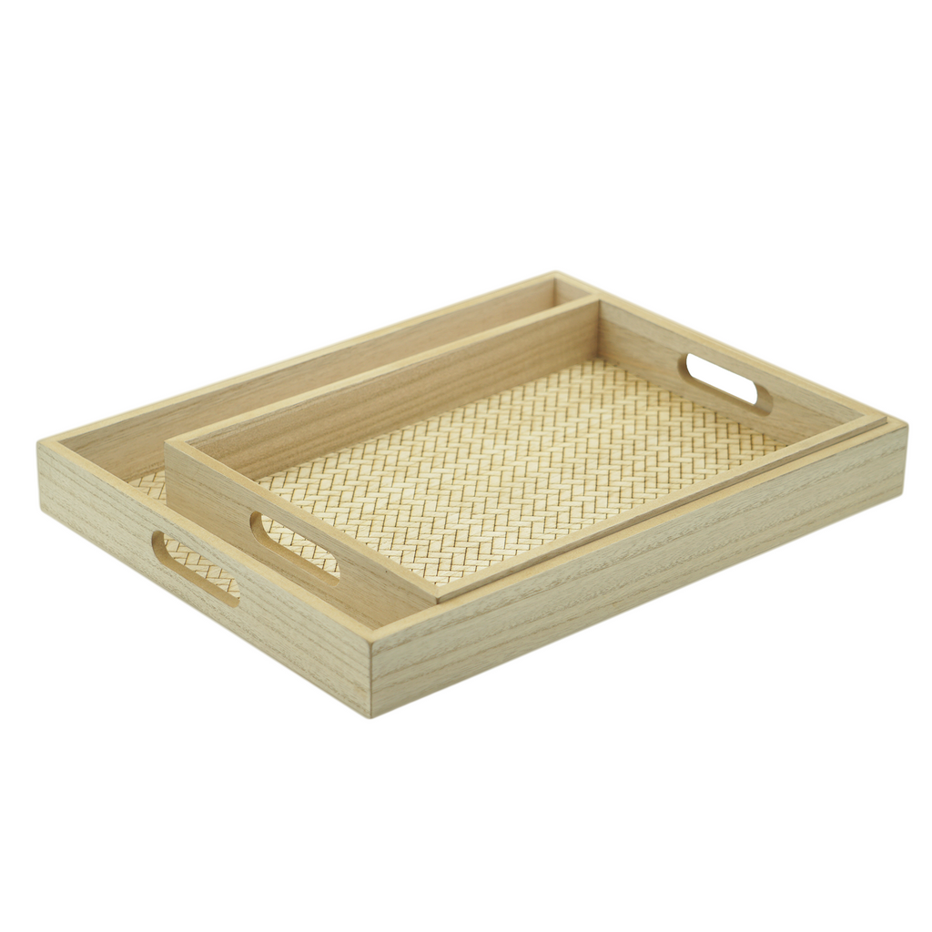 Conjunto de 2 bandejas em madeira na tonalidade bege, que combinam resistência e elegância. Perfeitas para diversas finalidades, desde a organização até a apresentação de alimentos e objetos. O acabamento natural realça a textura da madeira, conferindo um toque sofisticado e atemporal a qualquer espaço. Além da funcionalidade, essas bandejas oferecem durabilidade e facilidade de manutenção, tornando-se uma escolha prática e sofisticada para uso diário e ocasiões especiais.