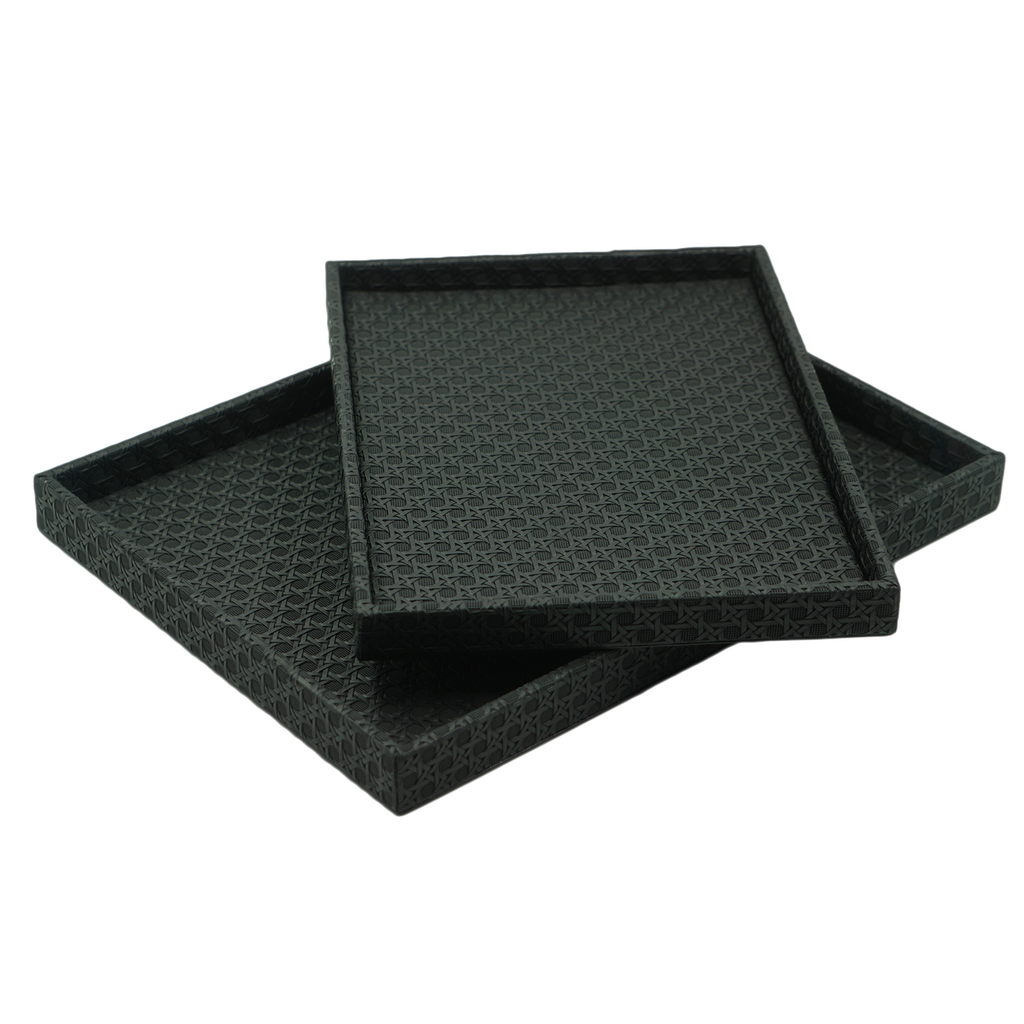 Conjunto com 2 bandejas em MDF revestidas com acabamento PU preto, que oferece resistência e sofisticação. O material proporciona durabilidade e superfície fácil de limpar, enquanto o design elegante e minimalista valoriza a organização e a apresentação de objetos ou alimentos. Ideais para uso em ambientes residenciais ou comerciais, combinam funcionalidade e estilo contemporâneo.