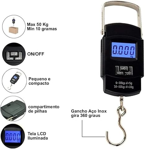 Balança digital com gancho ergonômico para pesagem precisa de bagagens, malas e cargas. Capacidade de até 50kg com precisão de 10g, display LCD nítido e função tara para descontar peso de recipientes. Portátil e leve, ideal para viagens, logística e uso doméstico. Bateria de longa duração e construção resistente em ABS. Perfeita para quem precisa de controle de peso em qualquer lugar.
