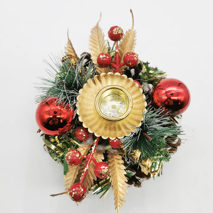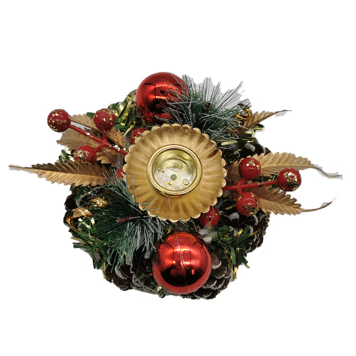 • Design: O arranjo apresenta uma base de pinheiro artificial decorada com pinhas, flores artificiais em dourado e vermelho (magnólias ou poinsétias), bagas vermelhas brilhantes e laços duplos em dourado e vermelho.