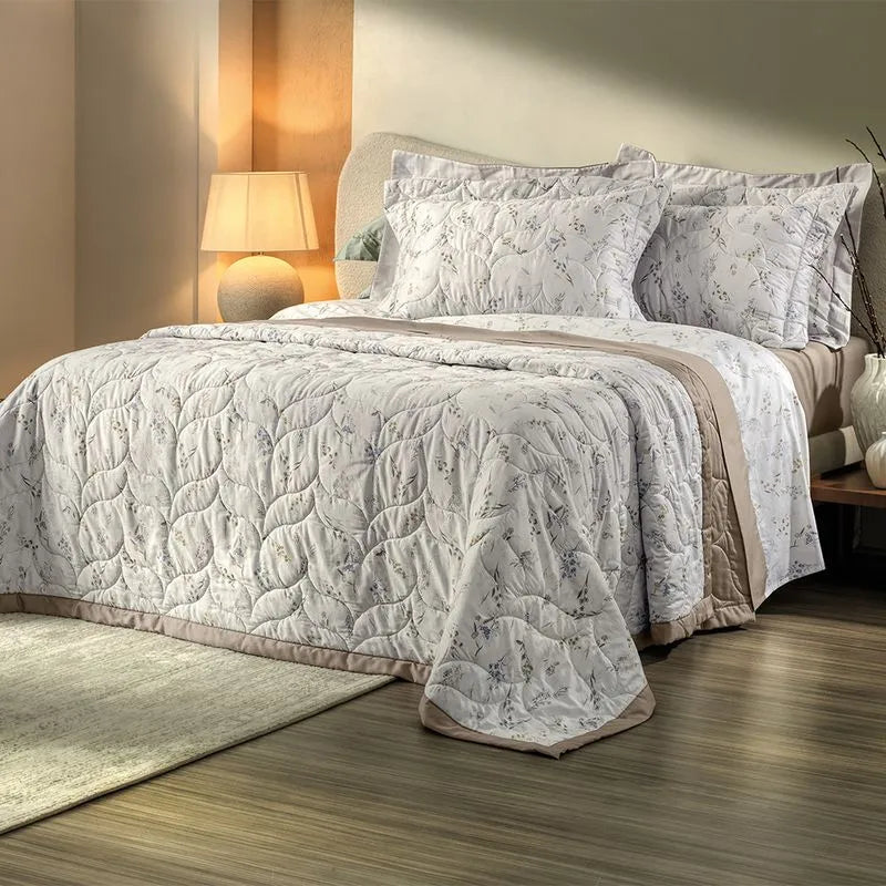Confeccionado em tecido 100% algodão com acabamento em cetim e 300 fios, o jogo de colcha oferece uma textura sedosa, macia e confortável. Além disso, sua composição de alta qualidade garante durabilidade, beleza e um caimento impecável, proporcionando charme e requinte à sua cama.