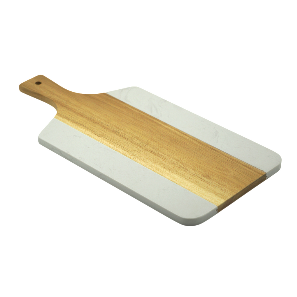 Placa de corte de madeira e mármore com dimensões de 42x20 cm, que une a resistência da madeira à durabilidade do mármore. A superfície de madeira oferece um apoio firme e seguro para o corte, enquanto o mármore proporciona uma área elegante e fácil de limpar. Ideal para uso prático na preparação de alimentos, combina funcionalidade e estética sofisticada em uma peça versátil para sua cozinha.