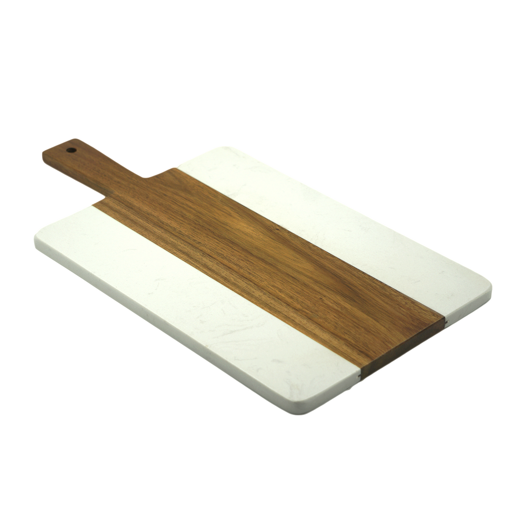 Placa de corte em madeira e mármore com dimensões de 45x24 cm, que oferece combinação ideal entre durabilidade e sofisticação. A madeira proporciona superfície estável e resistente para cortes precisos, enquanto o mármore confere elegância e facilidade na limpeza. Perfeita para uso na preparação de alimentos, esta placa une funcionalidade e design refinado, sendo uma peça versátil e prática para qualquer cozinha.